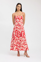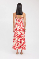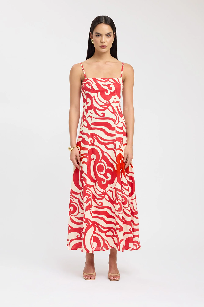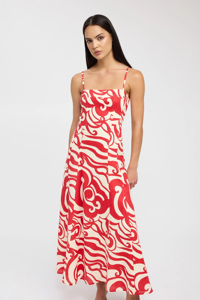 The Roma Maxi Dress is a sophisticated and stylish piece. Crafted with a bold red and cream abstract print, this dress features a flared hemline and adjustable spaghetti straps for a flattering and versatile fit. The straight neckline and panelled detailing along the dress add a touch of elegance, making it the perfect rental for the festive season and beyond.