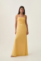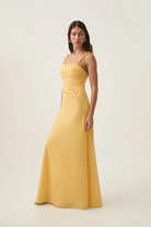 The fitted ruched bodice enhances your silhouette, while the side zipper ensures a seamless fit. A subtle split hem adds movement and allure, perfectly complementing the dress’s low scooped back for an unexpected touch of drama.