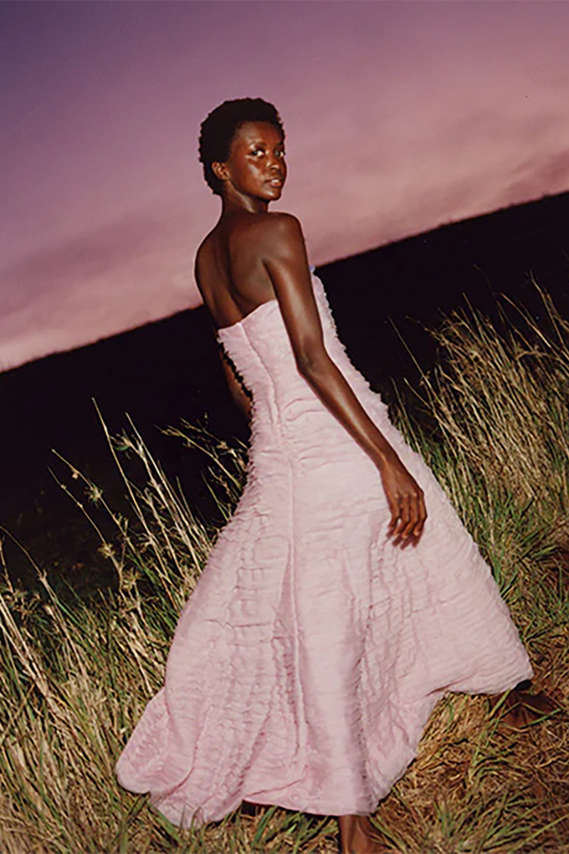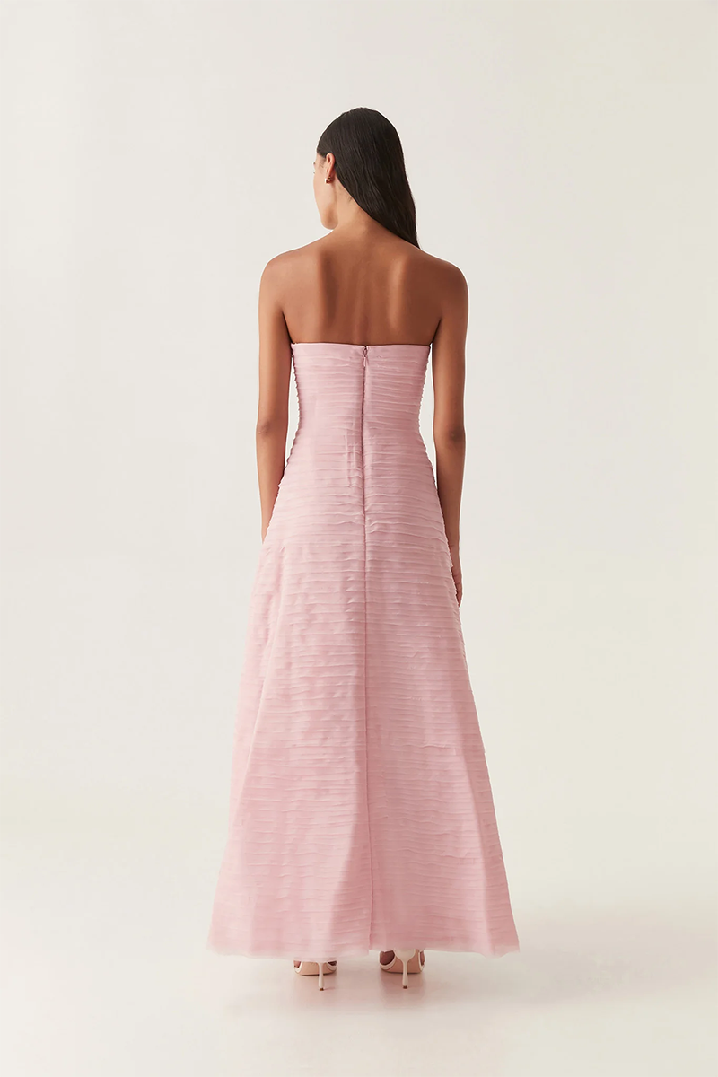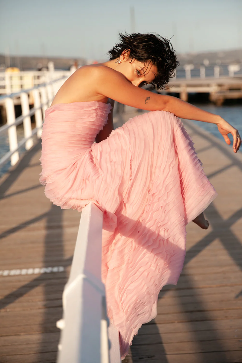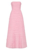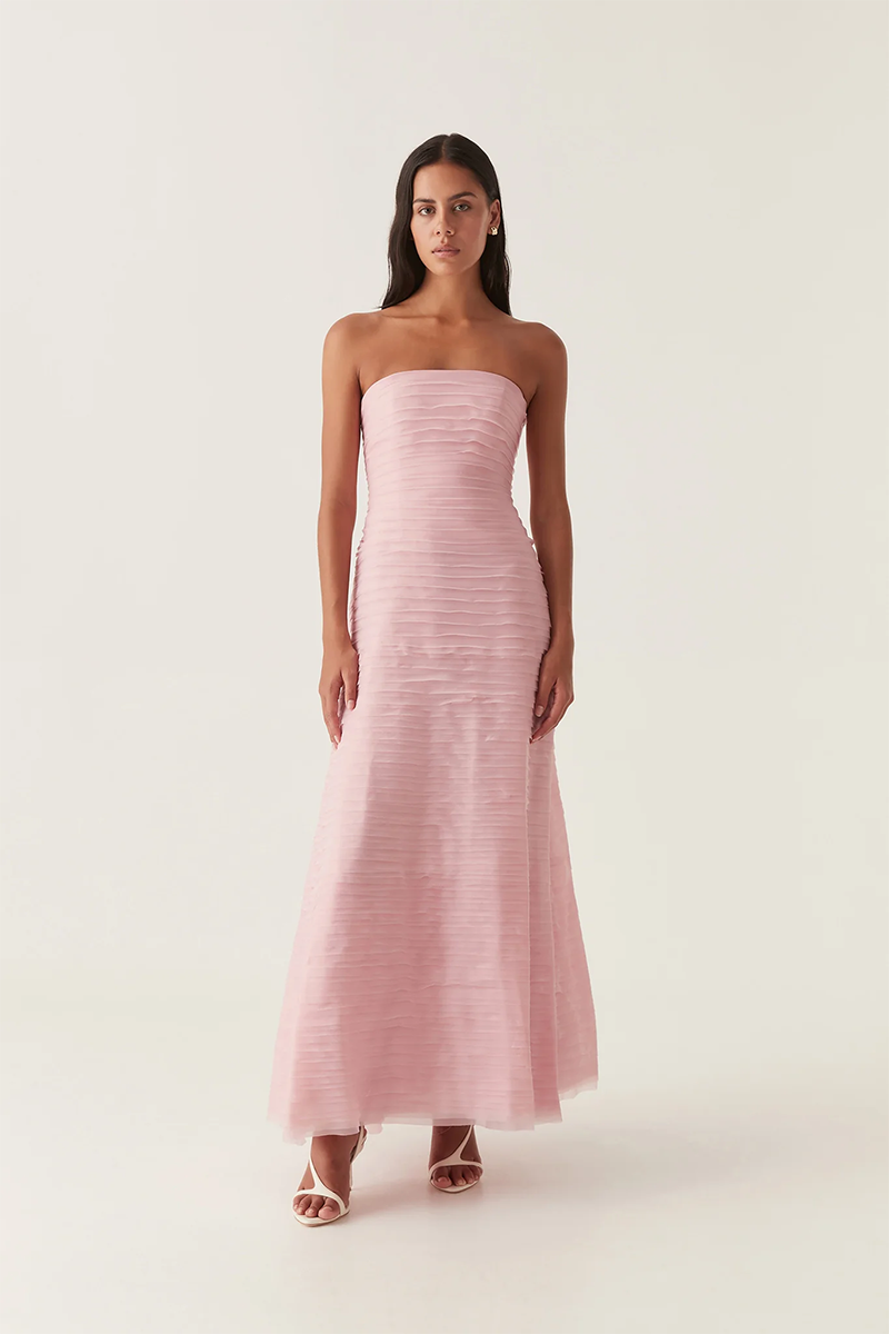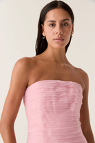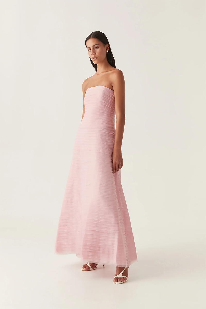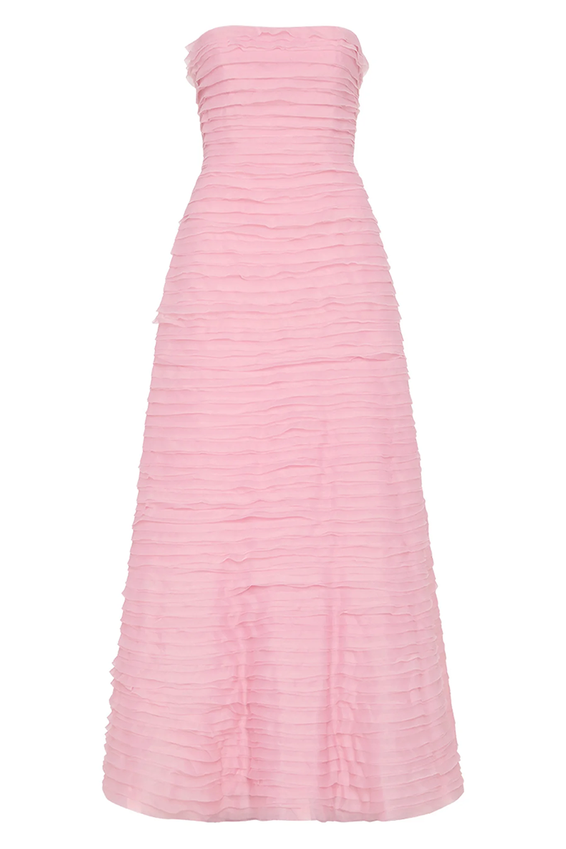 Be a vision in the gorgeous Soundscape Maxi Dress rental from Aje. This strapless maxi sports horizontal organza frills throughout in a gorgeous pink shade for an ultra-feminine look. Perfect to hire for weddings, the fitted bodice with internal boning falls into a voluminous skirt for a showstopping silhoutte.