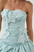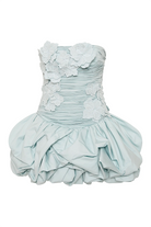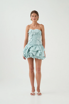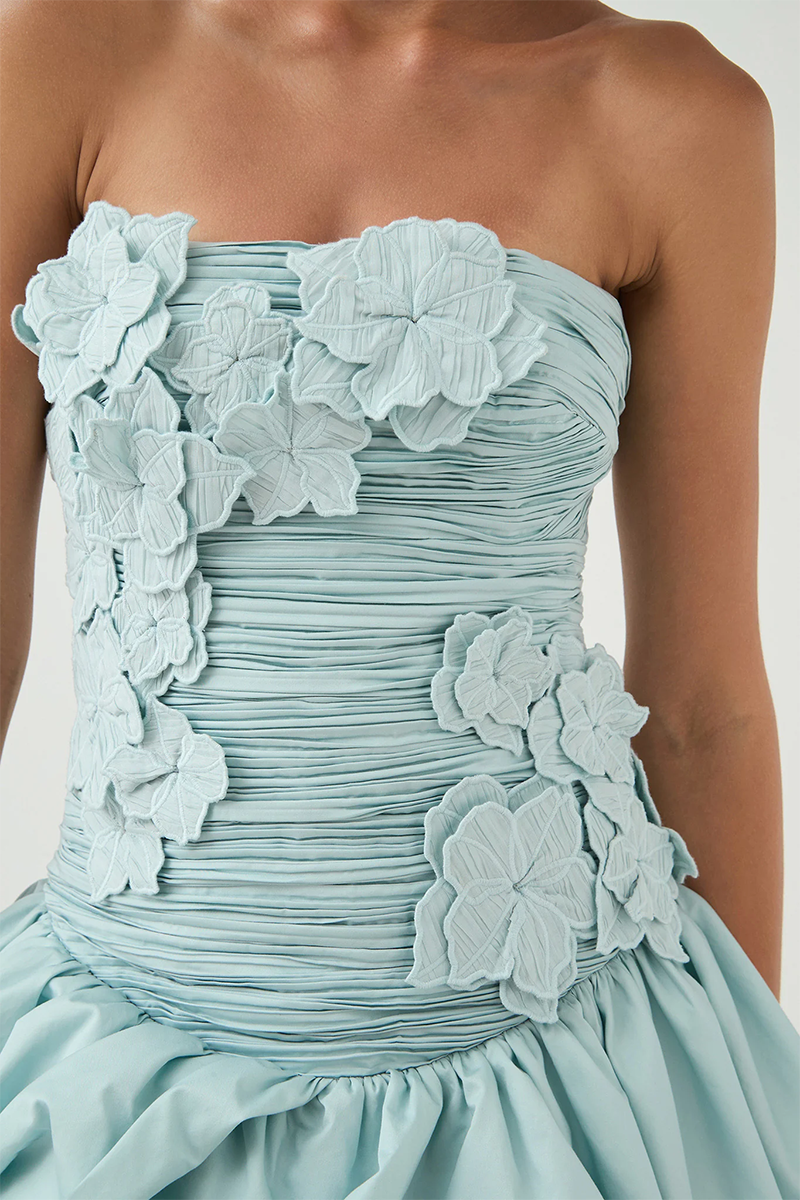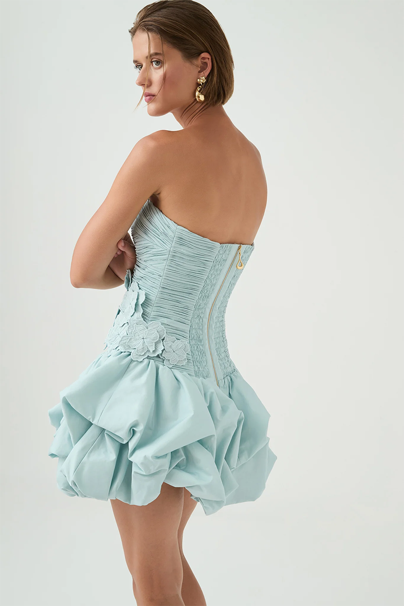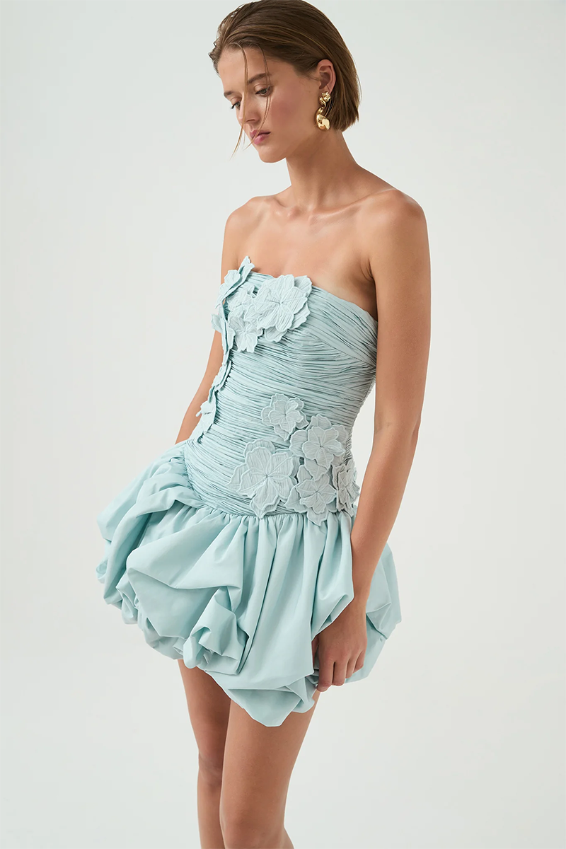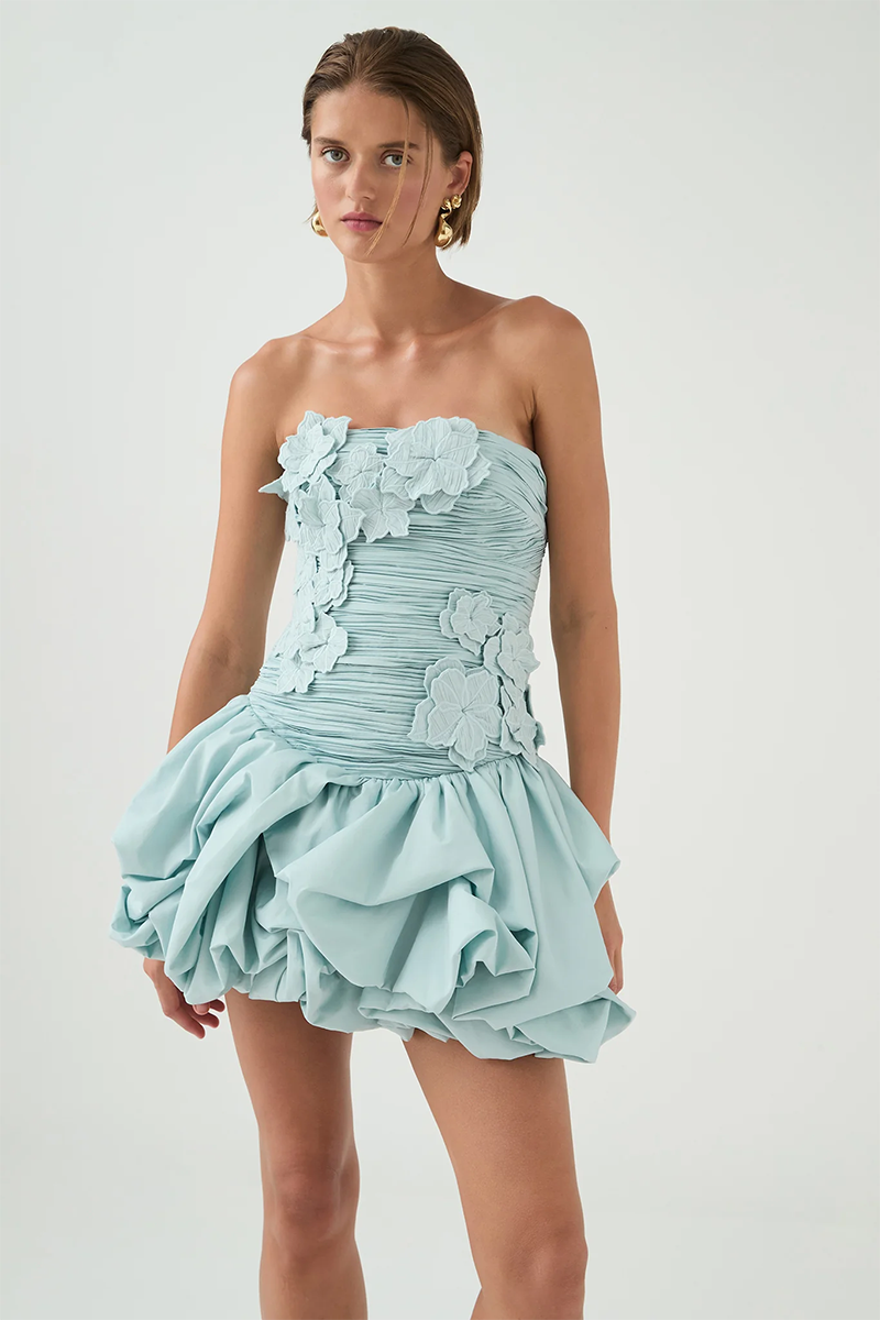 The Splendour Mini Dress by Aje is a modern expression of femininity with a sculptural twist. Designed in a soft silver blue hue, this strapless mini dress features a straight neckline and a fitted, ruched bodice that flatters and defines. Delicate floral embroidery adds texture and charm, while the voluminous bubble hem brings playful drama to the silhouette. Finished with an exposed back zip and Aje’s signature sculptural puller, this fully lined piece is crafted from 100% cotton for breathable comfort.