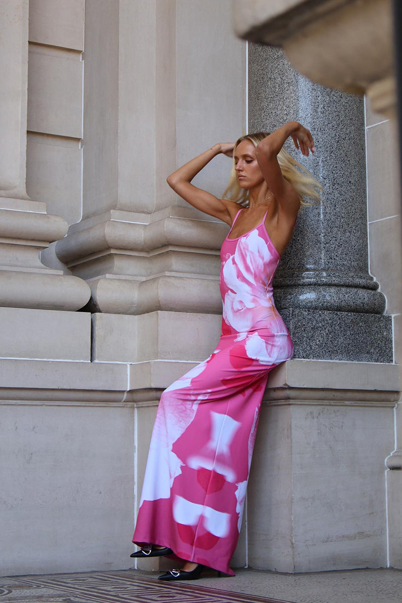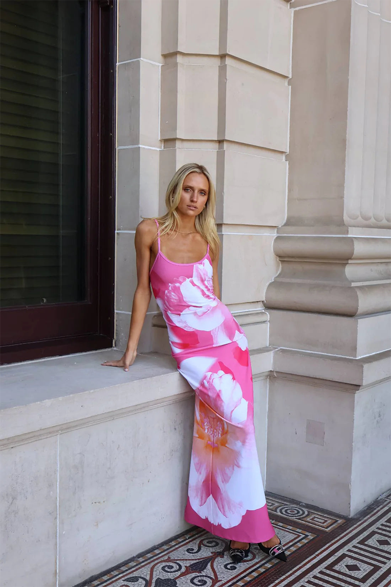 The Valentina Slip Dress is the epitome of femininity and glamour. Crafted in a delicate pink-hued print, this elegant maxi dress is designed to flatter with its signature figure-hugging silhouette. Featuring adjustable straps for a customizable fit, a graceful round neckline, and a sultry rear split, it moves effortlessly with you. Made from a semi-stretch material, it offers just the right balance of comfort and structure.