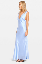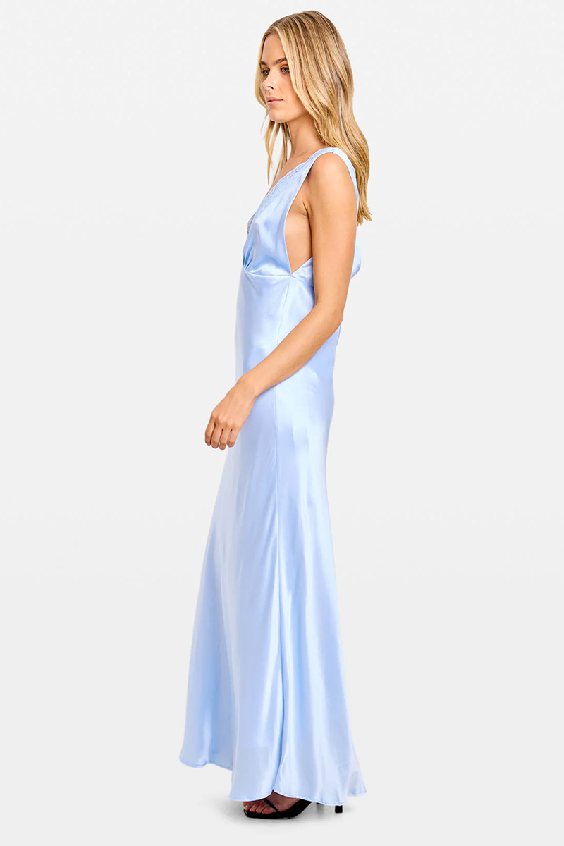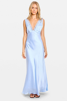 Indulge in this luxurious Vintage Maxi Dress in Powder Blue by Maison Essentiele. This dress hire is crafted from gorgeous 6A silk and featuring delicate floral lace detailing. The buttery soft fabric gently drapes over the body, creating an elegant and feminine silhouette. One of our favourite rentals for weddings and ball season.