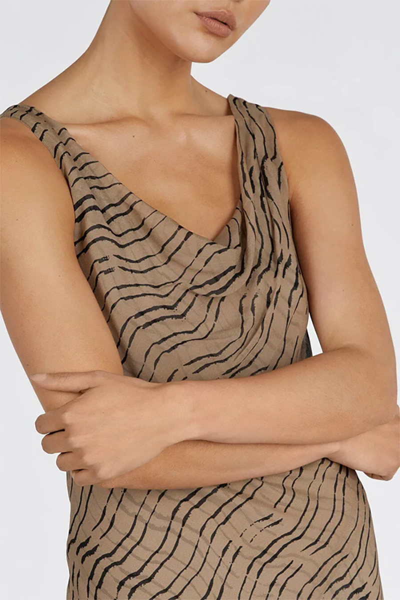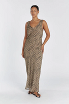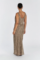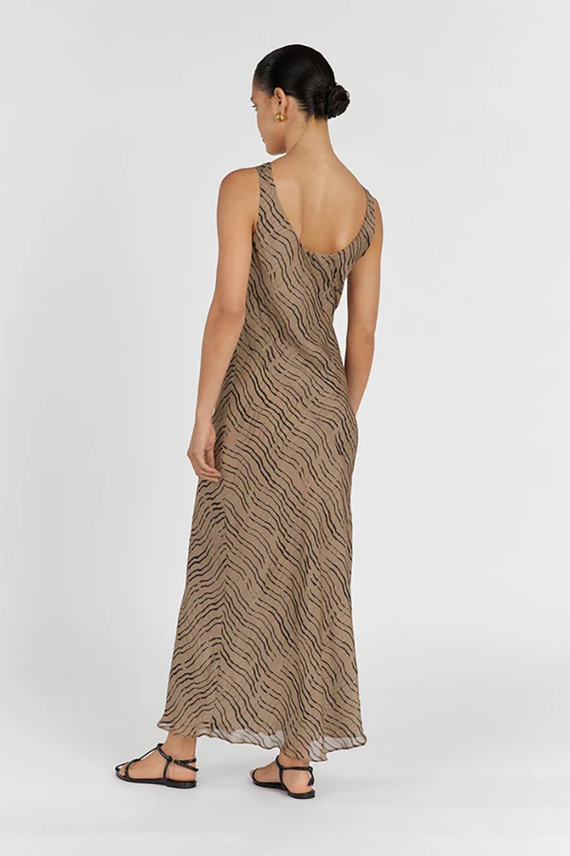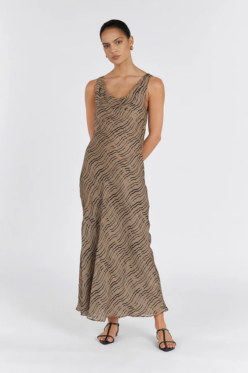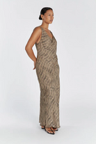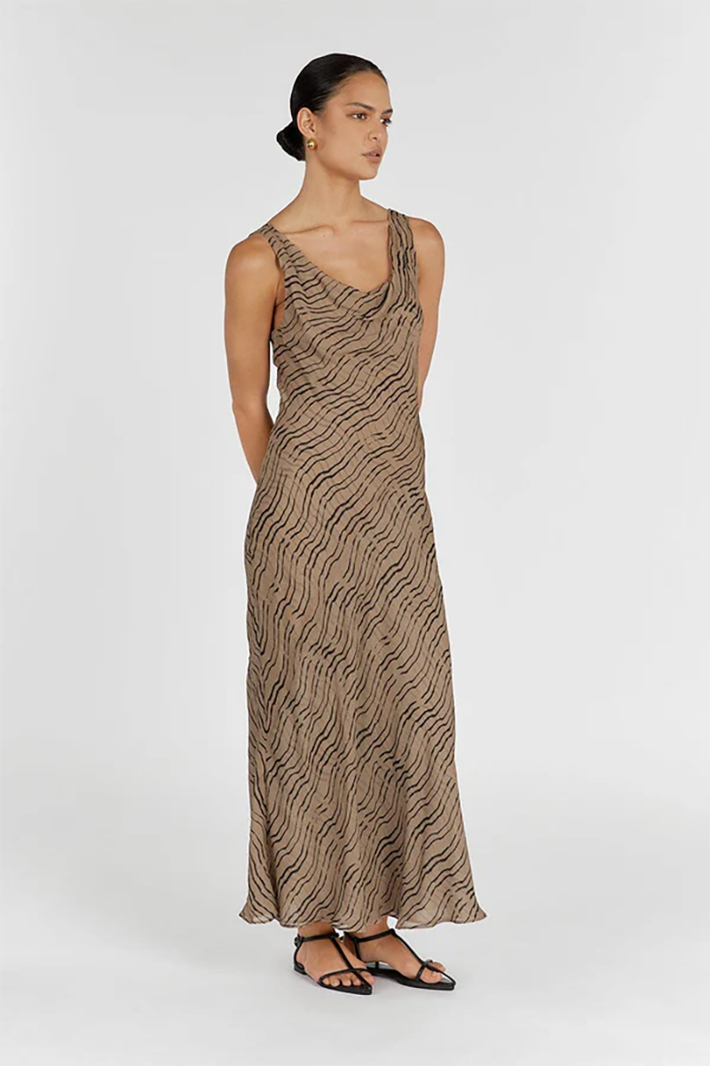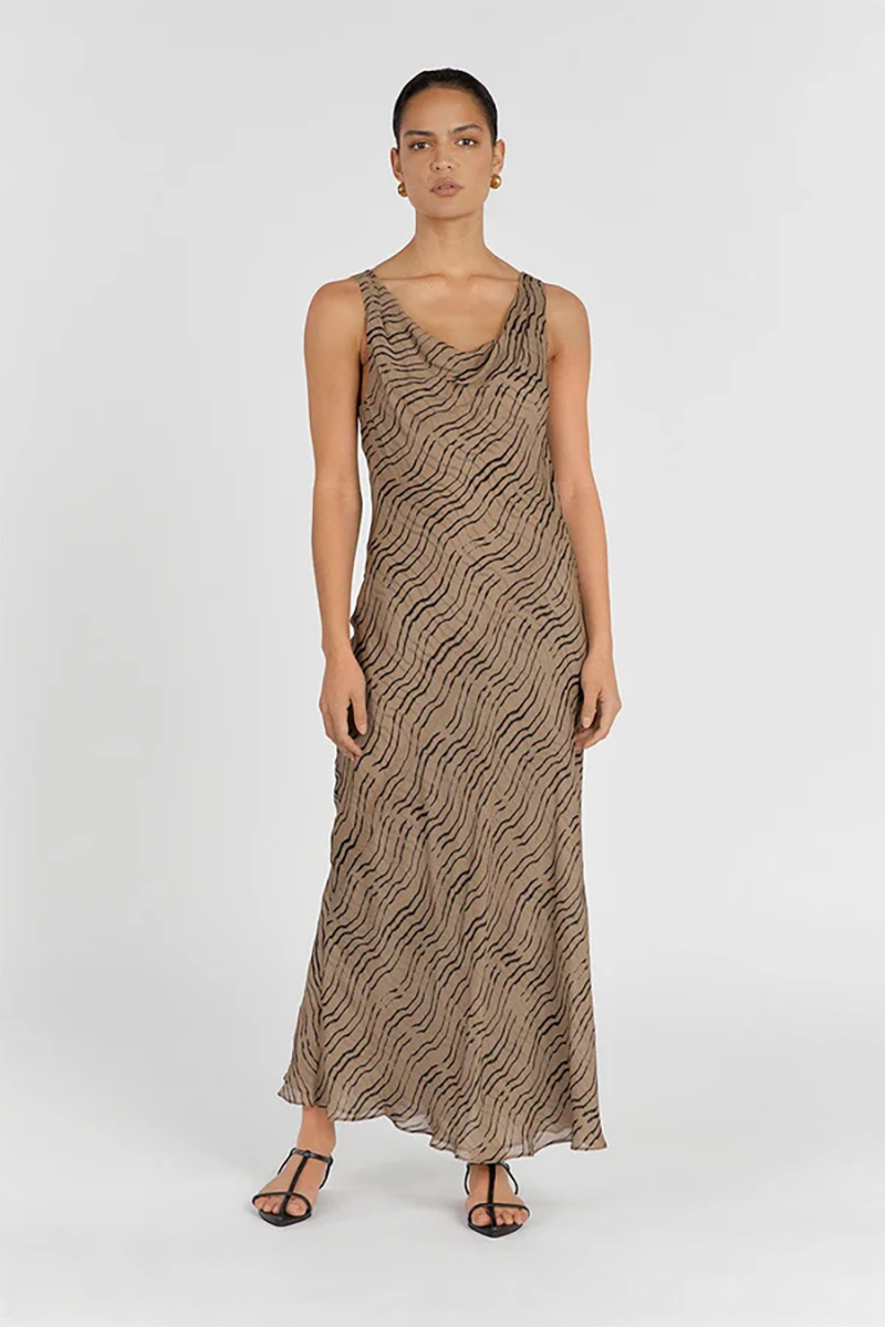 Our Clair Cowl Neck Maxi dress in a gorgeous chocolate animal print shade is the perfect maxi for your next event. With a cowl neck and bias cut, this full length sleeveless gown is a favourite rental for weekend brunches and outdoor events.