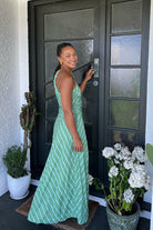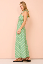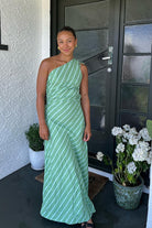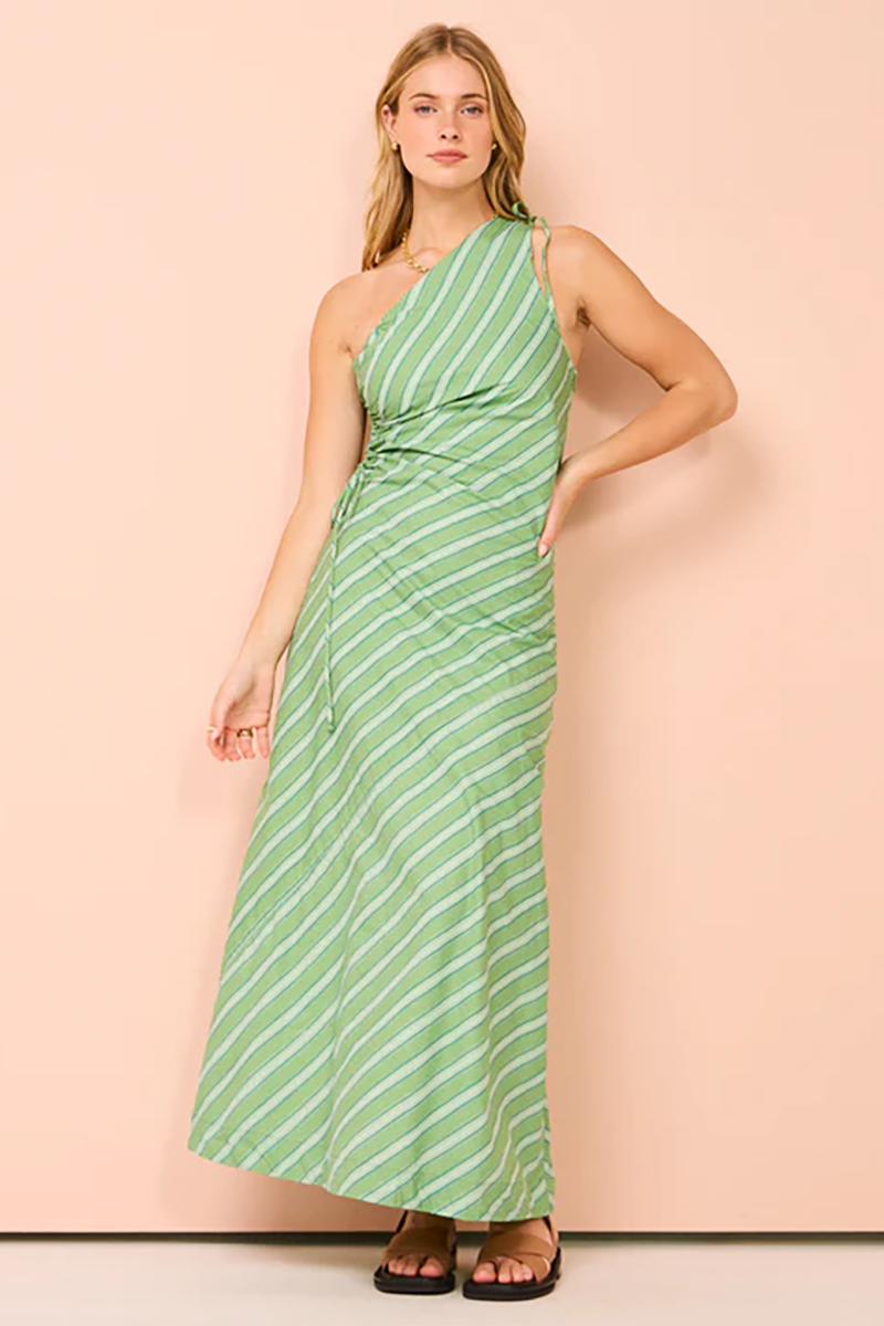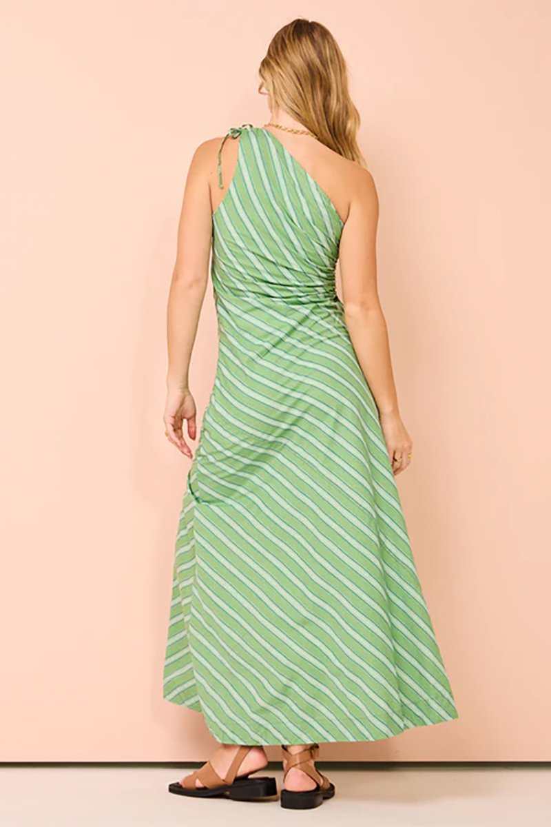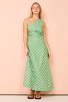 Enjoy the warm embrace of summer in our Laureles Midi dress in Akaia Stripe Green. Crafted from a lightweight fabrication, this midi dress features a one shoulder asymmetrical neckline, tie up detail on the shoulder and drawstring detail on the side of the waist.