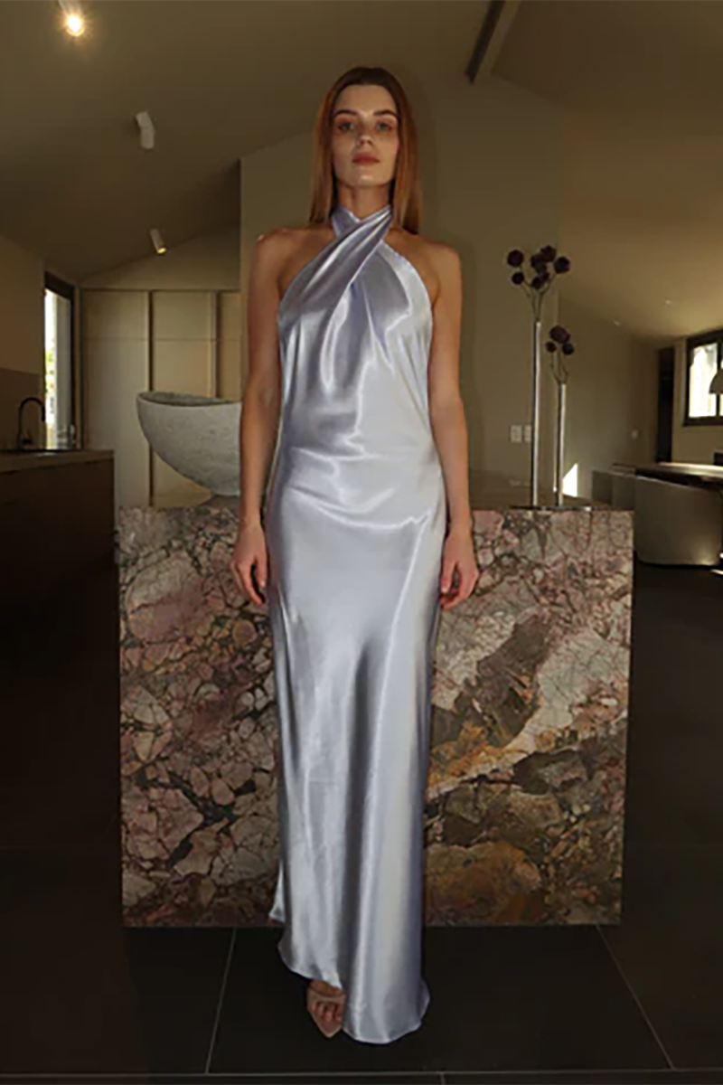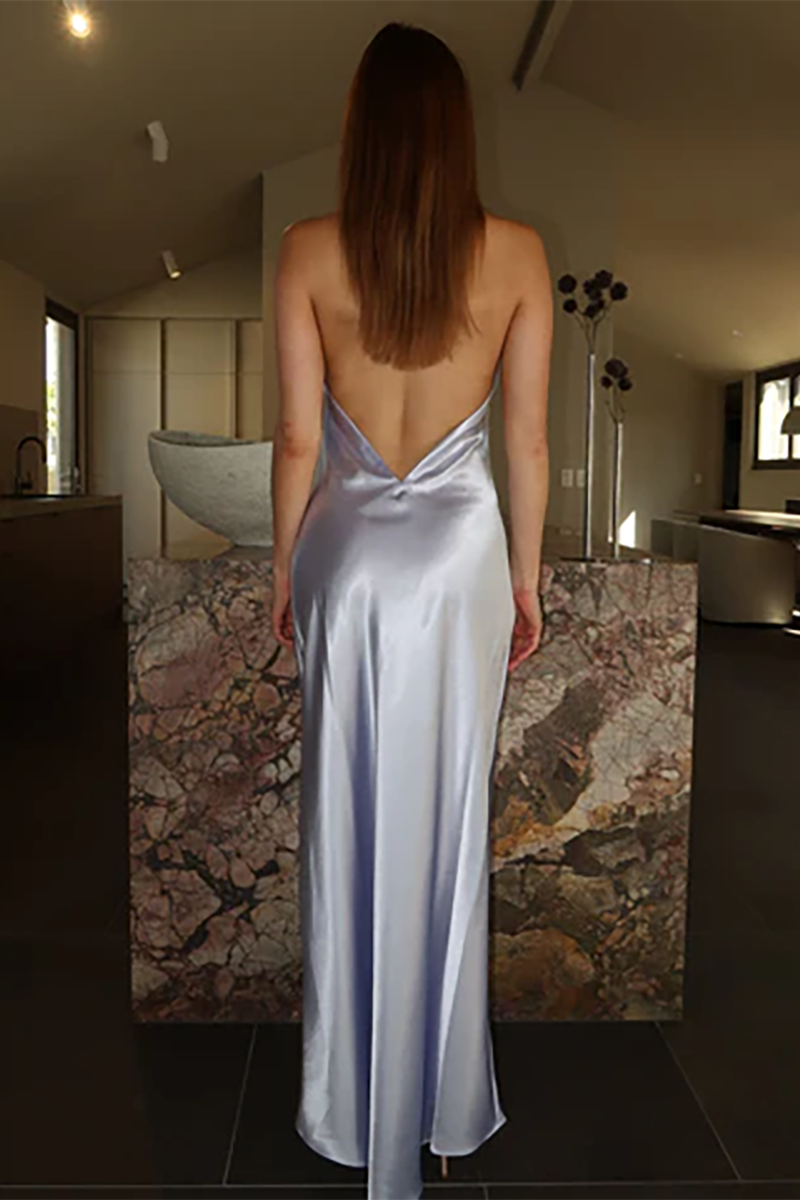 The Lilac crossover maxi is a bias cut full length dress with a crossover neck feature. The adjustable neck tie and deep v back make this the perfect number to rent for your next special event.
