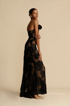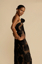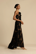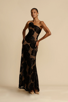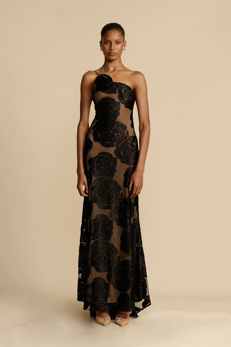 Introducing Marcella, a sensual statement gown that fuses elegance and individuality. Made in a timeless large scale floral print with a luxe velvet finish, gracefully lined in a tan mesh. Marcella’s flattering bodice features an asymmetrical neckline, thoughtfully designed to lift and shape the bust. For intricate details, she’s finely finished with a hand-tacked silky rose, french seams and dainty shoulder strap. Marcella was designed to be bold, her exaggerated train gracefully trails behind the dress for an elevated look. Complete her look with some delicate jewels, a timeless heel and let her own the evening in style.