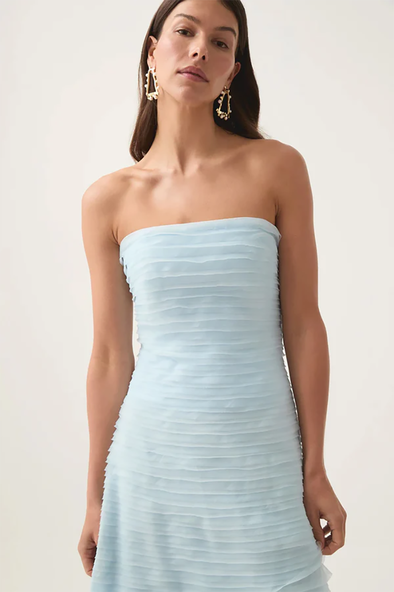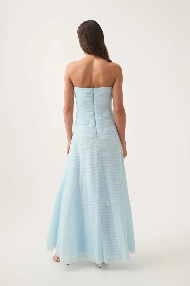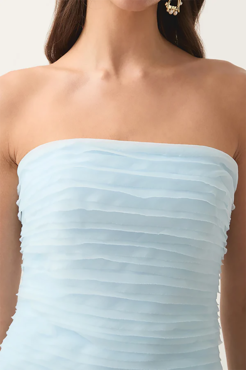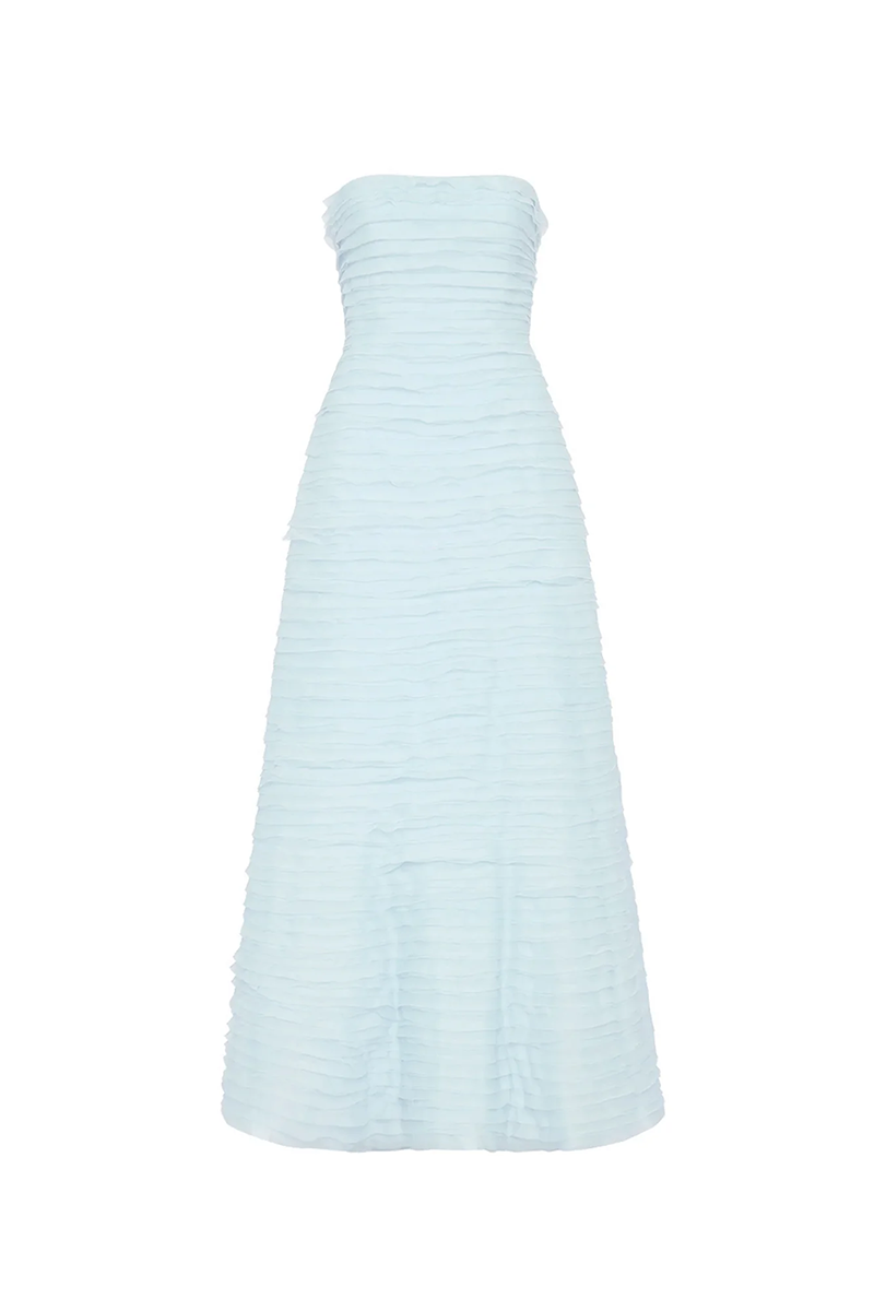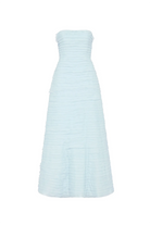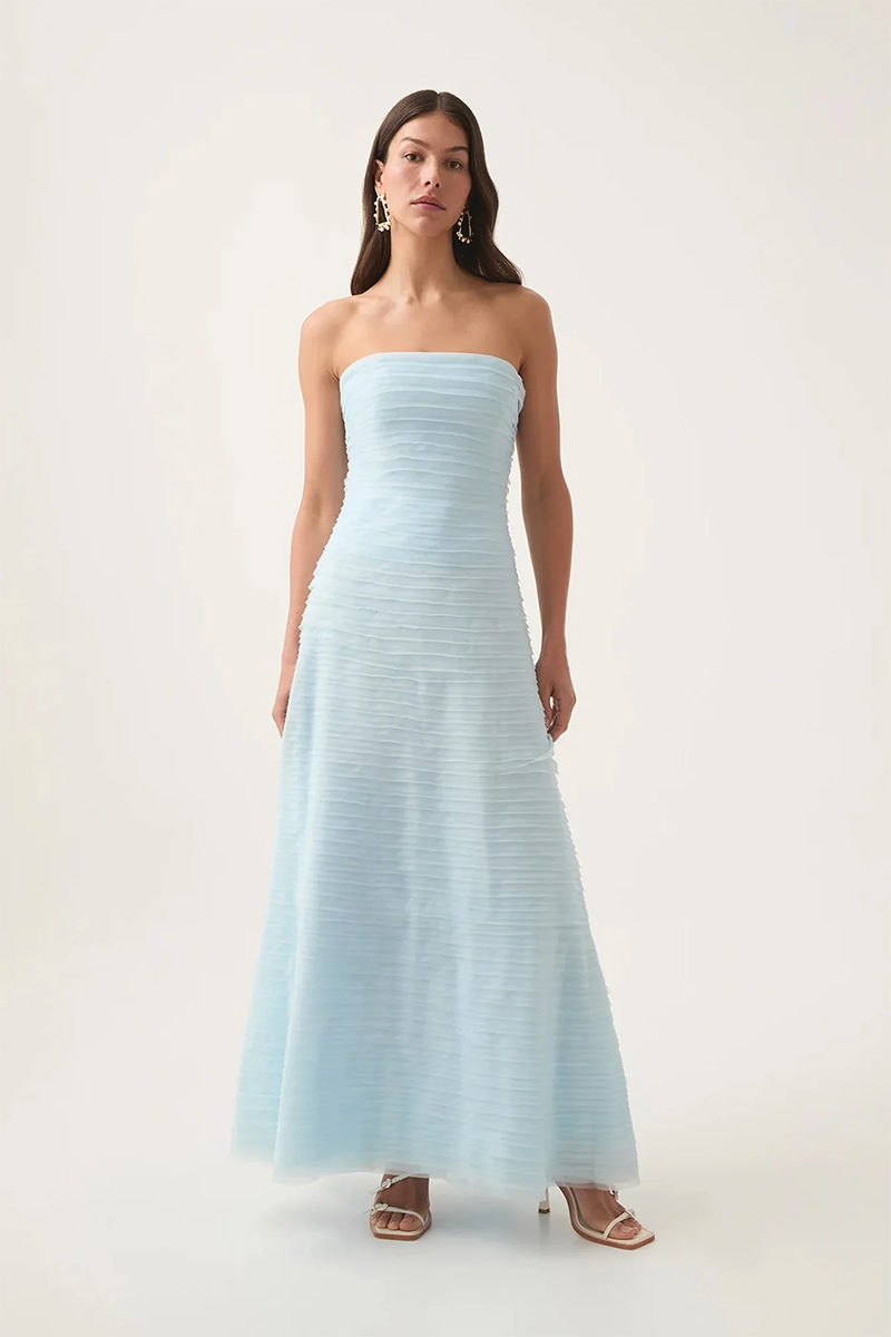 Be a vision in the gorgeous Soundscape Maxi Dress rental from Aje. This strapless maxi sports horizontal organza frills throughout in a sea breeze shade of blue for an ultra-feminine look. Perfect to hire for weddings, the fitted bodice with internal boning falls into a voluminous skirt for a showstopping silhoutte.