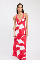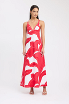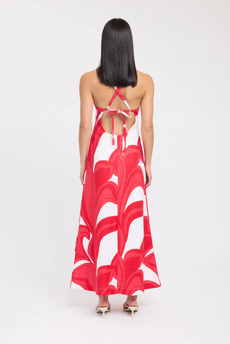 The Zani Maxi Dress is a refined summer essential. Crafted from 100% printed palm linen with a soft cotton lining, it offers a blend of comfort and sophistication. The bold red and white print enhances the silhouette, featuring a V-neckline with adjustable straps for a personalized fit. A cinched waistline accentuates the feminine shape, while the fit-and-flare design flows gracefully into a maxi-length hemline, making it a timeless addition to any wardrobe.